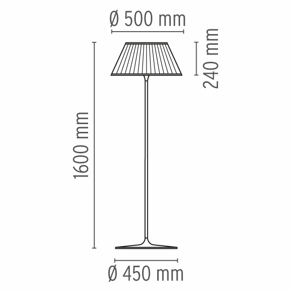 - Габаритные размерыв. 160 / Ø 50 / Ø плафона 50 / Ø основания 45 см.