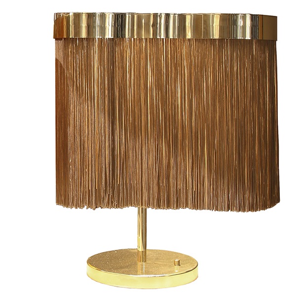 Бахрома на плафонах изготовлена из огнестойкой ткани Trevira, корпус из полированной латуни. Источником света является встраиваемый светодиодный модуль с 3х ступенчатым диммированием по кнопке, расположенной на основании.