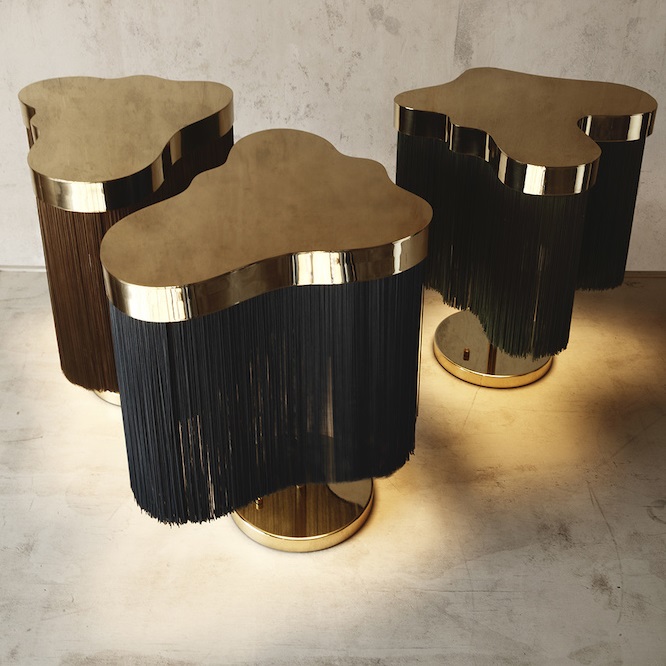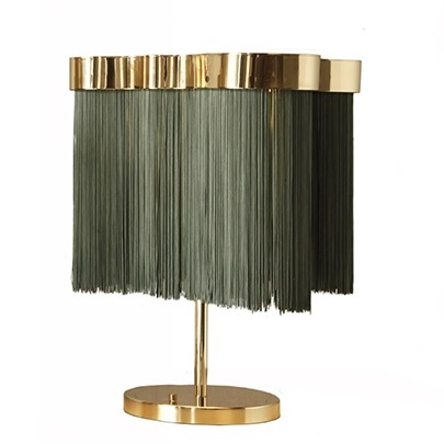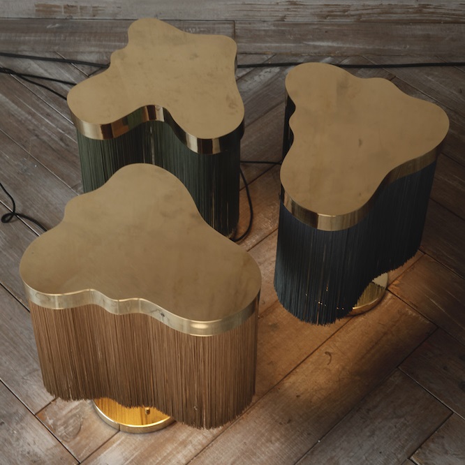 Бахрома на плафонах изготовлена из огнестойкой ткани Trevira, корпус из полированной латуни. Источником света является встраиваемый светодиодный модуль с 3х ступенчатым диммированием по кнопке, расположенной на основании.