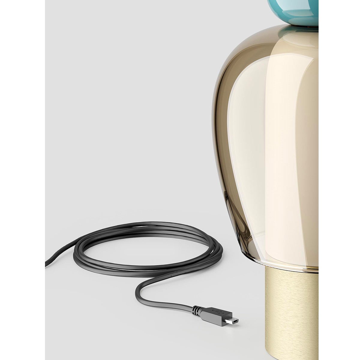 Закругленная ручка, расположенная в верхней части, позволяет включать и выключать светильник, а также диммировать интенсивность и теплоту света. Разъем micro-USB в основании корпуса позволяет перезаряжать батарею.