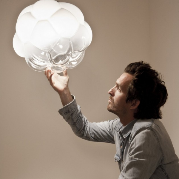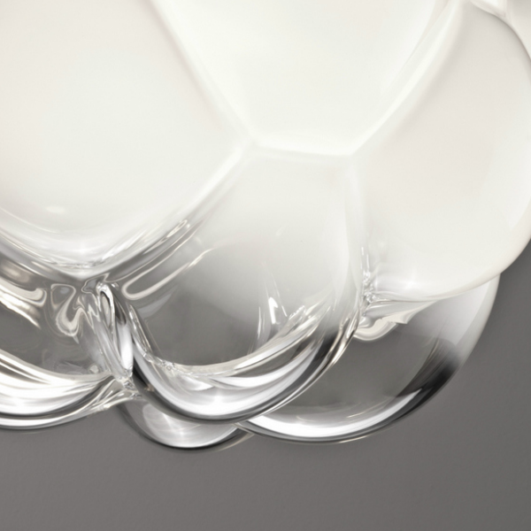 Стеклянная форма Cloudy воспроизводит идею конденсации воды из водяного пара. Получается самое настоящее облако из выдувного белого и прозрачного стекла, из которого будто вот-вот закапает вода. Для изготовления была применена сложная конструкция, которая придает светильнику легкость и воздушность самого настоящего облачка. Если зажечь Cloudy будет казаться, будто солнечный луч пробивается сквозь облако.