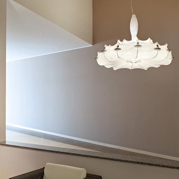 Flos. Его напыляют прямо на арматуру светильника, заворачивая его в кокон. Шар из граненого стекла, расположенный в нижней части светильника позволяет наполнять помещение мерцающими бликами, создавая праздничную атмосферу. Сам же плафон светится ровным мягким светом, как огромный дирижабль, парящий в небе.