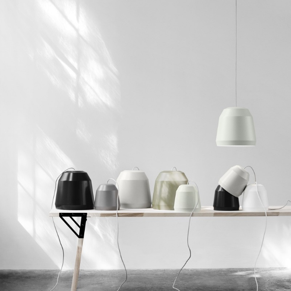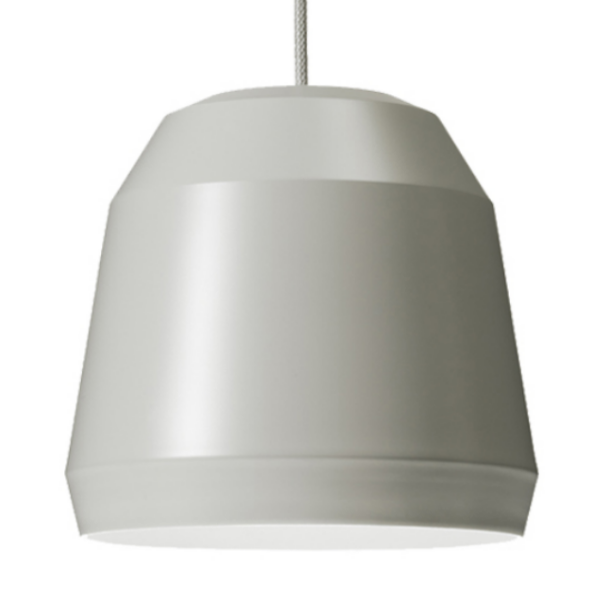 Плафон светильника выполнен из алюминия и имеет небольшое отверстие, оснащенное акриловым кольцом. Такое приспособление позволяет небольшому количеству света проникать вверх и освещать подвес. Светильник представлен в двух размерах и шести цветовых оттенках.