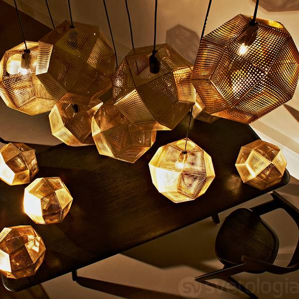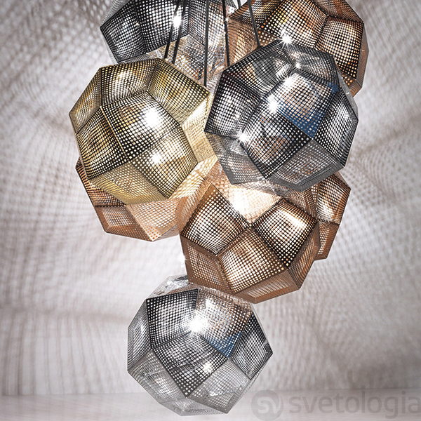 Etch shade – индустриальное вдохновение от британского дизайнера Tom Dixon. Вдохновленный чистой математикой, светильник-конструкция Etch shade состоит из пластин толщиной всего 0,4 мм. Ажурная поверхность плафона красиво пропускает свет. Несколько размеров и металлических цветов позволяют создавать невероятные скульптурные кластеры – инсталляции.